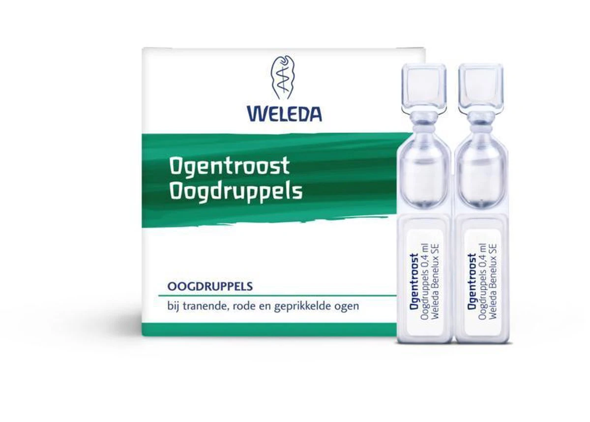 Ogentroost Oogdruppels hebben een verzachtend effect bij tranende, rode en geprikkelde ogen. Ogentroost Oogdruppels bevat Euphrasia (ogentroost) in een isotone oplossing op basis van 100% natuurlijke ingrediënten. Euphrasia heeft een verzachtende en zuiverende invloed op het oog. Gebruik Ogentroost Oogdruppels bij tranende of rode ogen door pollen, vuiltjes, zon, wind of chloor van zwembadwater. De oogdruppels verzachten, verzorgen en verfrissen de ogen direct en kunnen langdurig gebruikt worden. Ogentroost Oogdruppels is er in 3 varianten. Ampullen 10 of 20 stuks (0,4 ml per ampul) en in een flesje (10 ml).